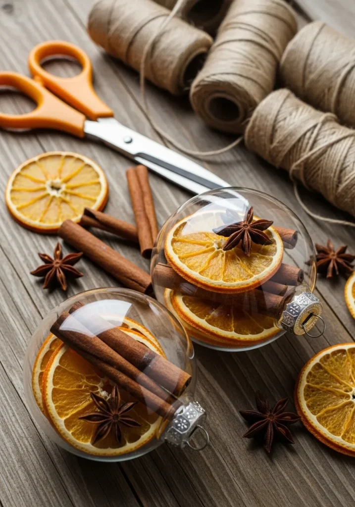 These glass ornaments filled with dried orange slices, cinnamon sticks, and star anise look and smell like Christmas in a jar. The rustic twine, craft scissors, and wooden tabletop make the scene feel so authentic and homey.