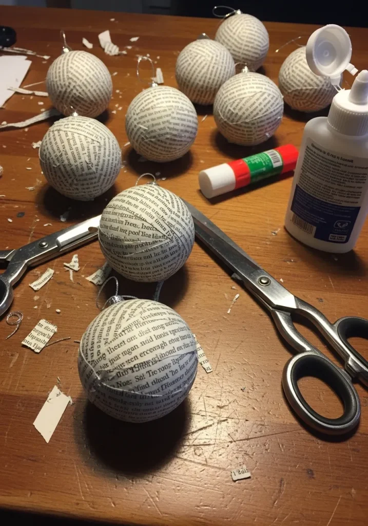Old newspaper clippings take on new life as they’re carefully wrapped around Christmas baubles. The scattered scraps, glue, and scissors tell the story of a quiet, creative afternoon filled with focus and fun.