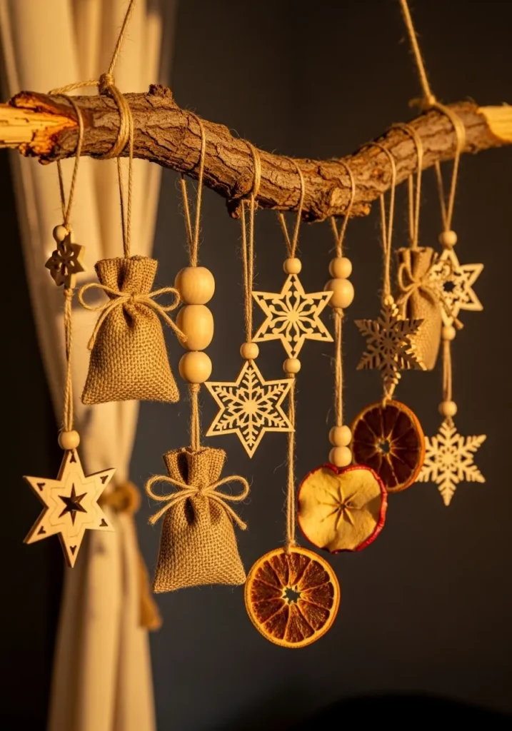 A sturdy branch becomes a beautiful display for handmade ornaments crafted from wood, burlap, and dried fruit slices. The warm glow of the lighting gives everything a golden, magical feel.