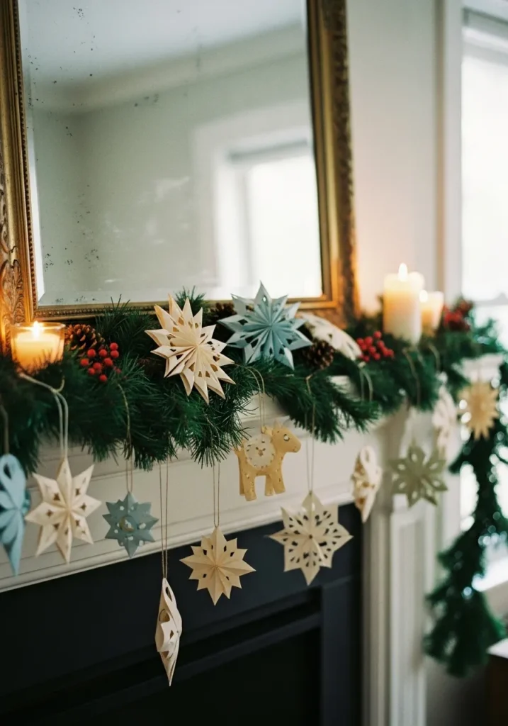 A charming mantle display mixes pale blue and cream ornaments with evergreen garlands and flickering candles. The folded paper stars and wooden shapes bring a touch of Nordic simplicity to the cozy glow.