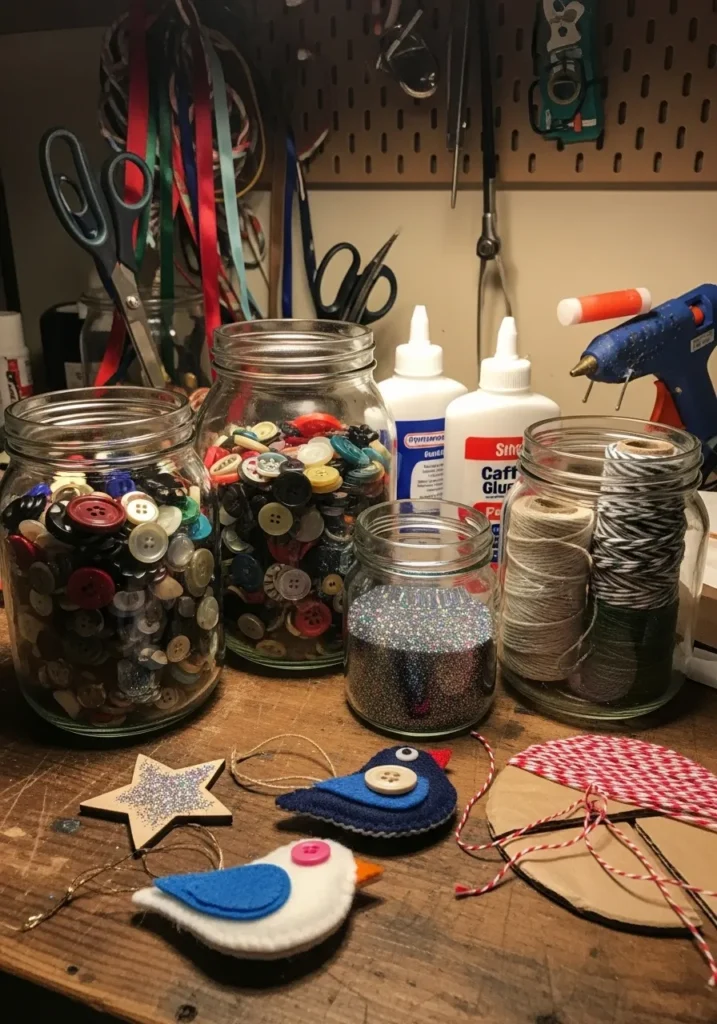 This little crafting corner is full of personality. Jars of buttons, ribbons, and glitter surround a few felt bird ornaments, each one finished with a sweet handmade touch.
