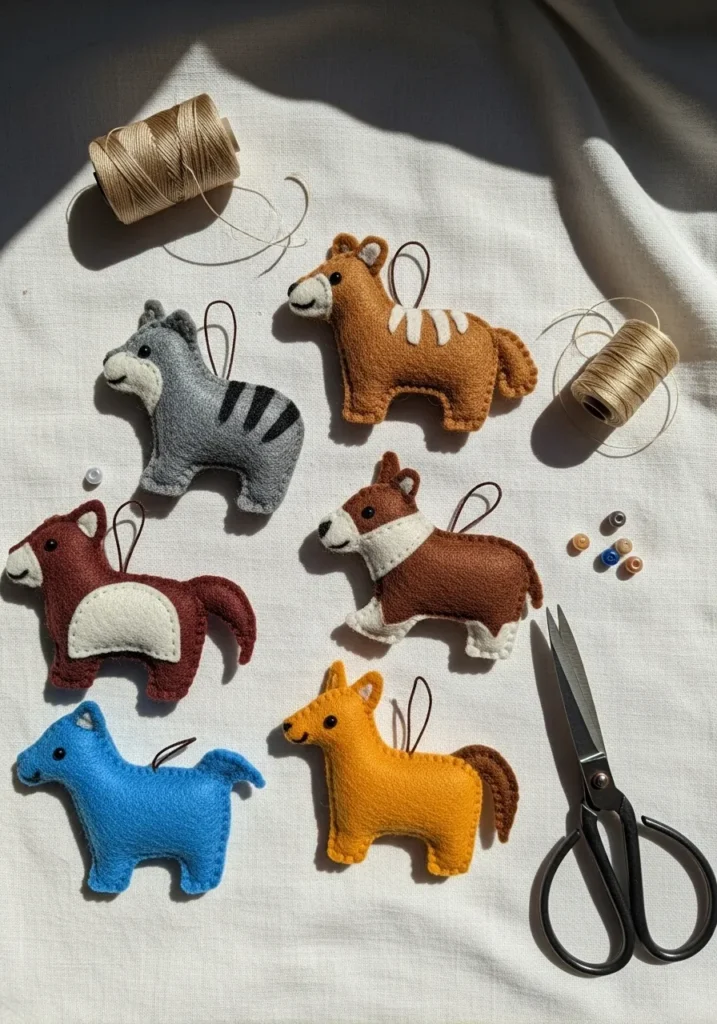 Tiny felt animals in soft, happy colors sit ready to hang on the tree. Each one is stitched with love, featuring playful details that make them look alive with charm.