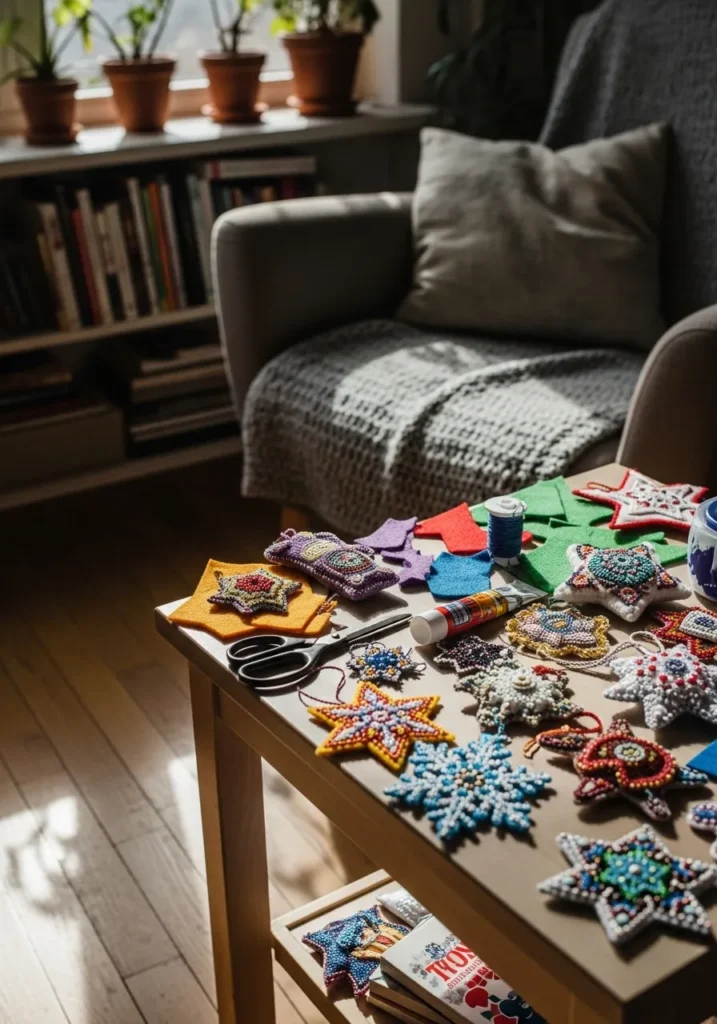 This cozy living room craft setup makes me want to spend the whole afternoon making ornaments. Colorful felt stars and hearts are scattered across the table, each one hand-stitched and decorated with tiny beads that catch the light.
