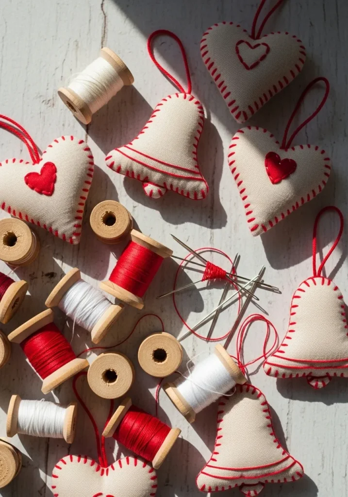 Soft fabric hearts and bells outlined with red stitching give these ornaments a vintage, homemade look that feels straight out of a childhood Christmas memory. Wooden spools of thread and sunlight on the table make the whole setup feel warm and inviting.