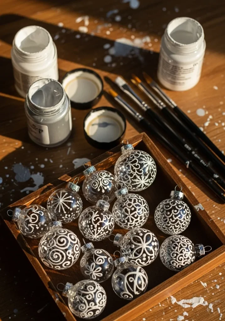 These clear glass ornaments painted with white intricate patterns are little works of art. The paintbrushes, open jars, and paint splatters tell a story of creativity and a bit of joyful mess.