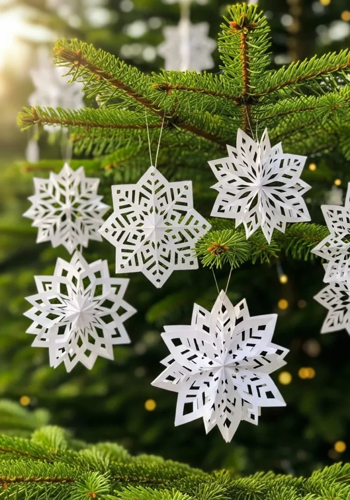 Delicate white paper snowflakes hang from a lush green tree branch, catching the light just right. Each one is perfectly cut yet still feels handmade, like something straight from a cozy weekend craft session.