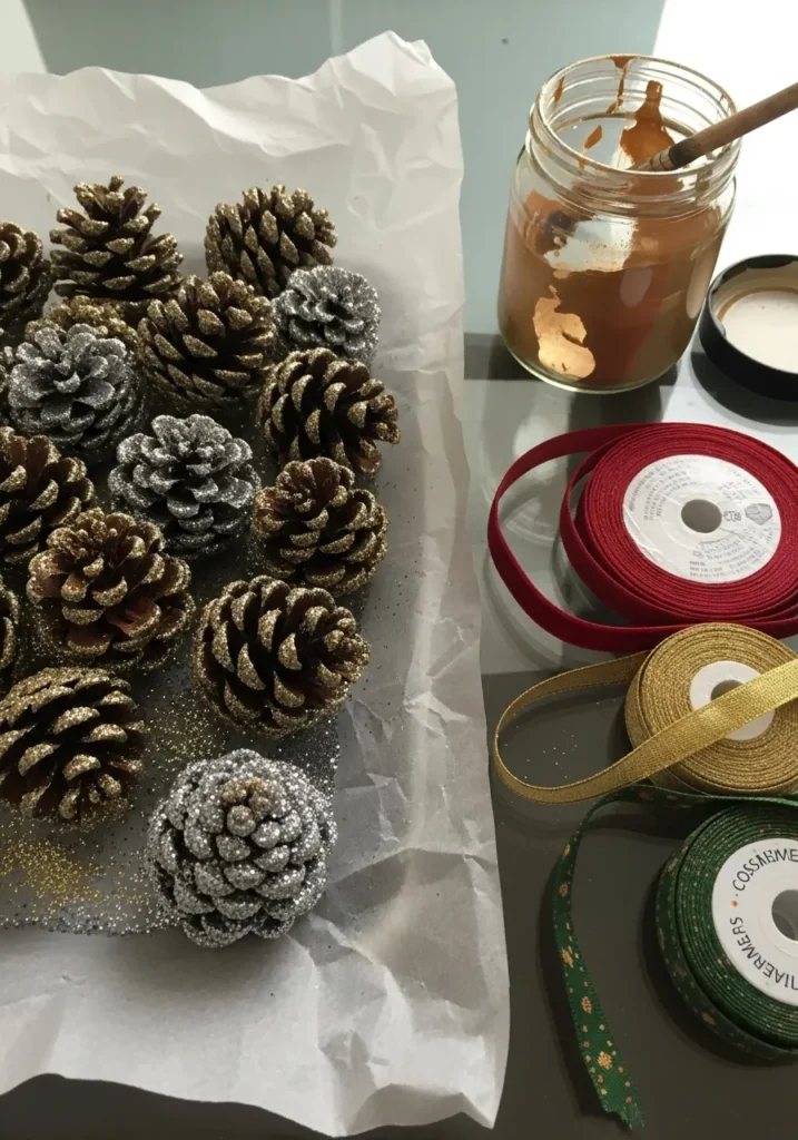 These glitter-dusted pinecones bring the forest straight to your Christmas tree. A mix of gold and silver shimmer gives them a touch of glam without losing that cozy, natural charm. The glass jar of metallic paint, a few ribbons, and a little bit of glittery chaos on the table tell the story of a fun crafting afternoon in progress.