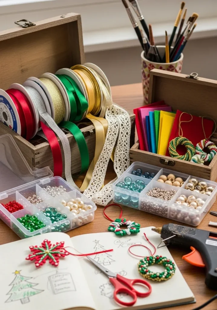 This cheerful crafting scene is full of possibilities. Bright ribbons, glass beads, lace, and felt sheets wait to be turned into festive creations. A few finished ornaments and a sketchbook of ideas hint at a day filled with creativity and joy.