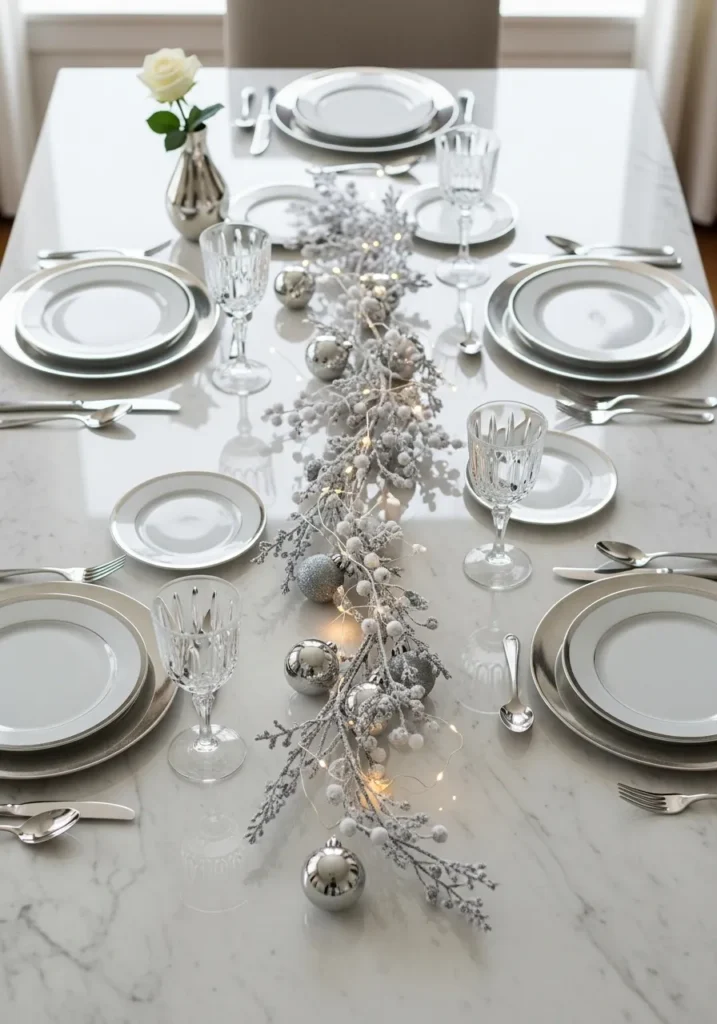 Cool tones and a sleek marble surface define this dreamy Christmas table. A frosted garland with silver ornaments and delicate lights runs down the center, framed by crystal glasses and soft metallic plates. It’s modern, wintry perfection.