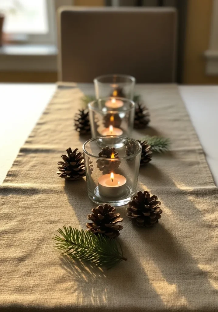This setup brings a cozy, rustic twist to modern style. A simple linen runner is lined with glass votives, pinecones, and sprigs of evergreen. The warm glow of the candles adds just enough charm to make it festive but still minimal.