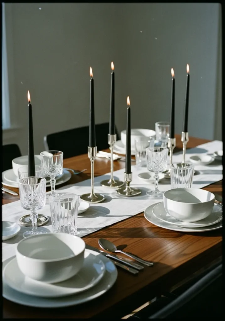 This design takes bold minimalism to a new level. Black taper candles rise elegantly from silver holders against a clean white table runner and modern white dinnerware. The mix of dark and light creates instant visual drama.