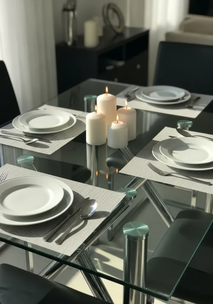 This design captures the essence of modern minimalism with a polished glass table and soft candlelight. The arrangement of white pillar candles at the center gives off a calm glow, perfectly balanced by the clean lines of white plates and silver flatware. Everything feels light, airy, and sophisticated.