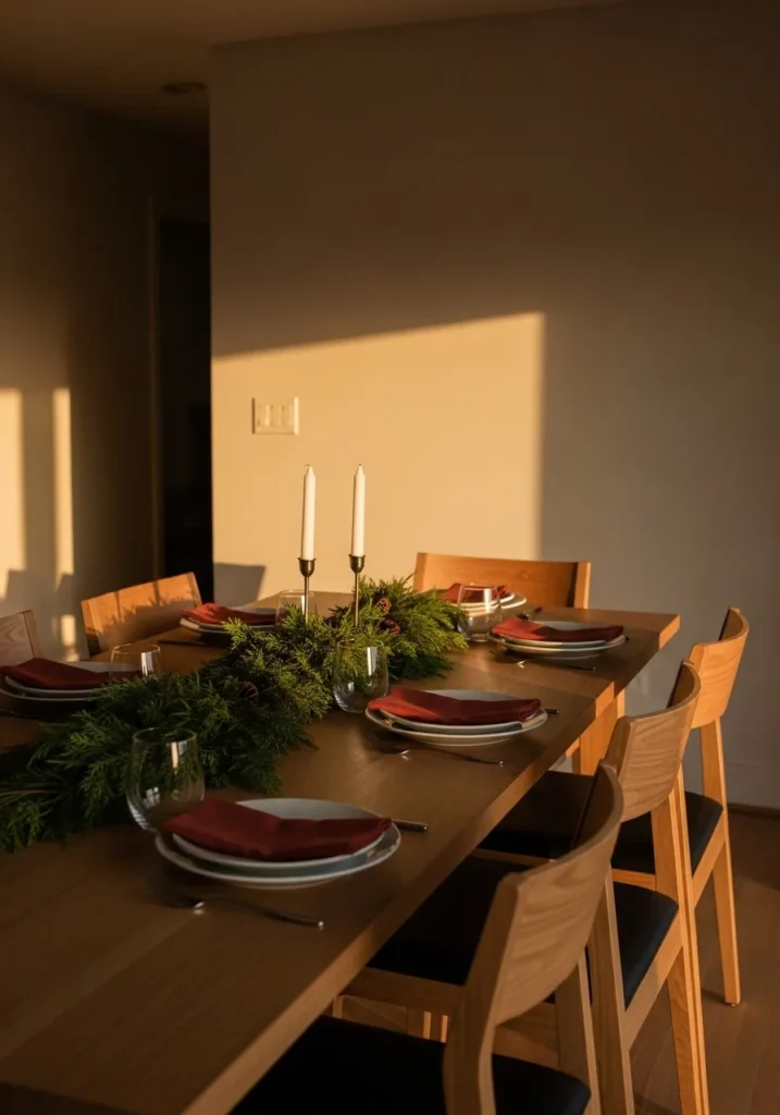 Warm sunlight and simple styling make this setup unforgettable. A natural wood table is decorated with a thick garland of evergreen branches, a pair of white candles, and rich red napkins that bring a subtle holiday touch. The golden light adds a cozy, nostalgic glow.
