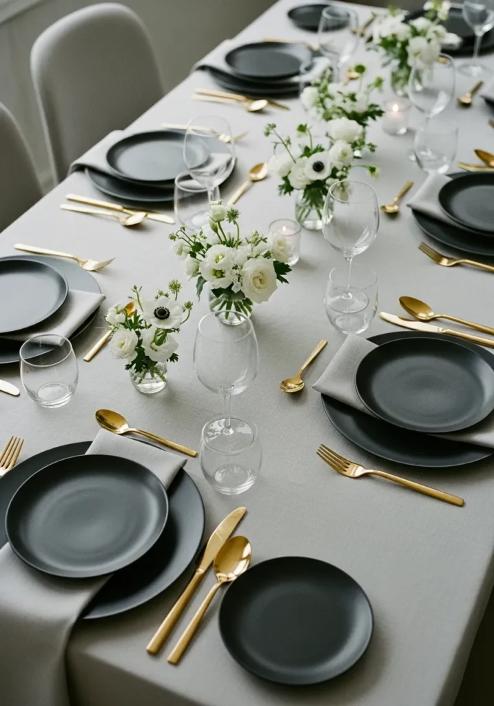 This table design is sleek and refined with its black plates, gray napkins, and gold cutlery. Small white floral arrangements soften the look, bringing a delicate touch to the bold color palette. Every element feels intentional and balanced.