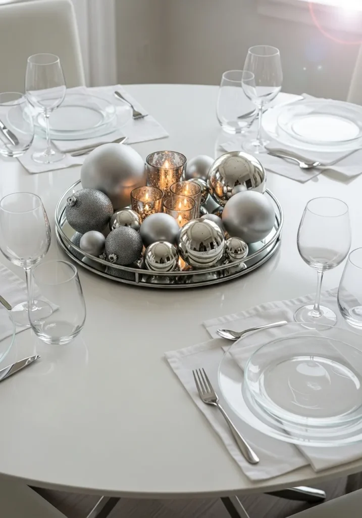Cool metallic tones take center stage here. A round white table features a mirrored tray filled with silver ornaments and glowing candles, surrounded by clear glass plates and simple linens. The entire setup feels sleek and polished from every angle.