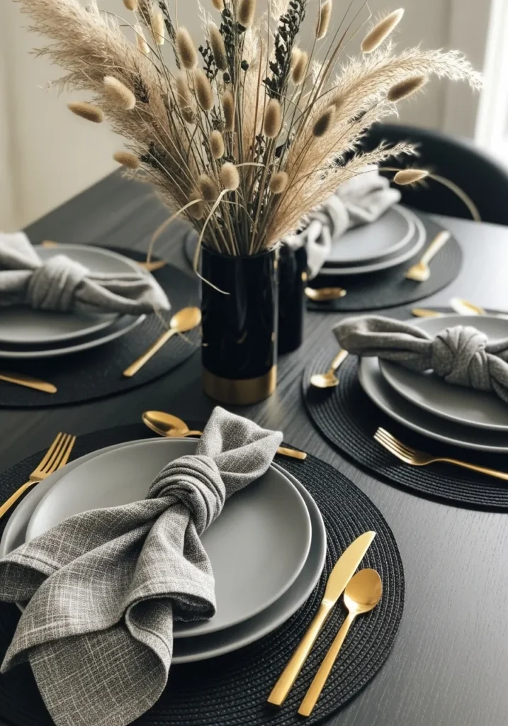 This dramatic table combines matte black dinnerware, gold flatware, and a stunning centerpiece of dried grasses in a black vase. The textures play beautifully together, creating a bold look that still feels festive.