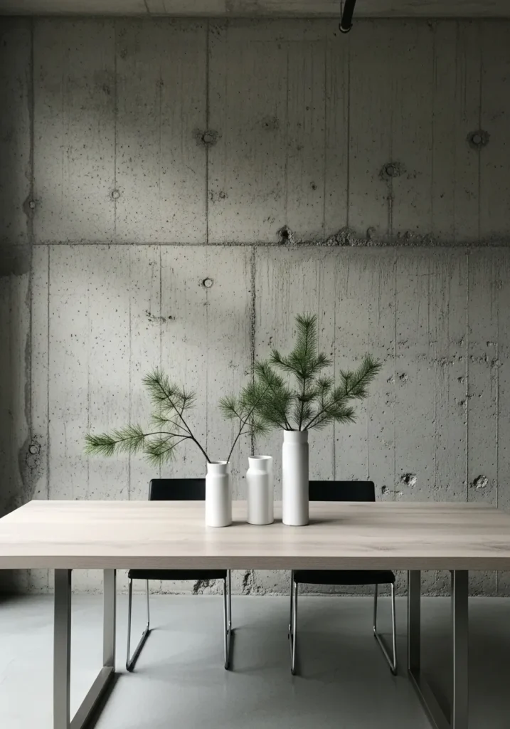 This table is a beautiful mix of raw texture and simplicity. The soft wood surface and rough concrete wall form a striking backdrop for slim white vases holding fresh pine sprigs. The look is understated yet festive, blending nature and modern design seamlessly.