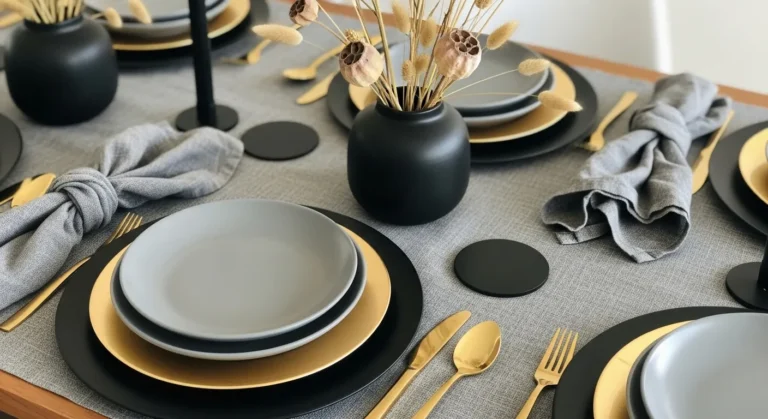 I love the mix of textures and tones here. The matte black plates and metallic gold cutlery complement each other perfectly, and the white flowers add that whisper of holiday freshness that makes the whole setup glow.