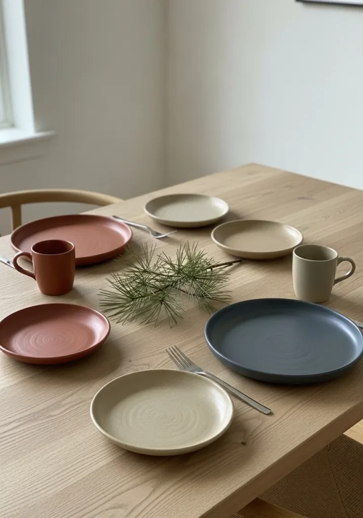 This setting feels cozy and contemporary all at once. The matte ceramic plates in warm neutrals and muted terracotta tones sit beautifully on a simple wooden table. A single sprig of pine brings a festive touch without overpowering the earthy palette. The mix of clay textures and natural colors makes this setup perfect for anyone who loves modern organic style.