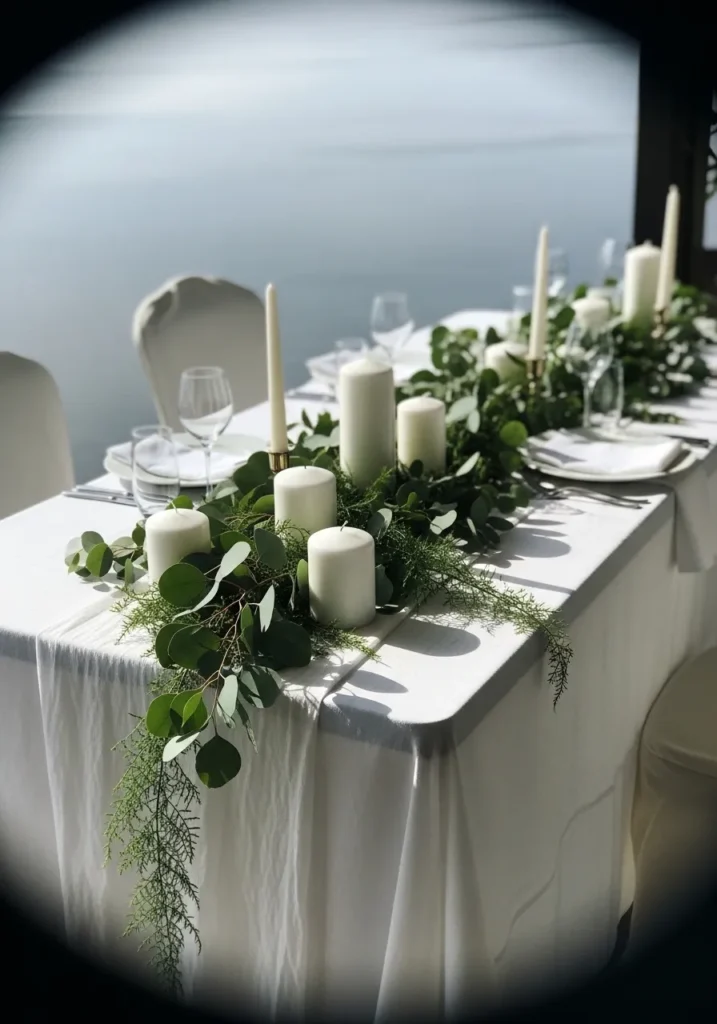 This table setting feels like a breath of fresh air. A cascade of eucalyptus leaves runs down a crisp white tablecloth, with ivory candles standing tall in between. The entire setup glows softly against the natural light, creating a calm, airy look that feels both elegant and organic.