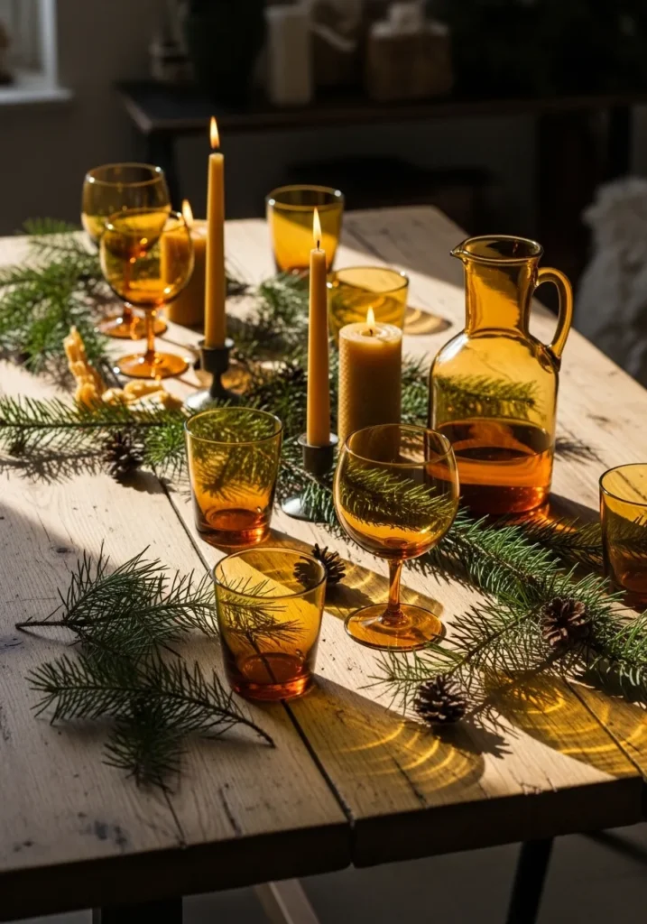 This table is pure mood. Honey-colored glassware catches the afternoon light, casting a golden shimmer across the wood. Sprigs of pine and simple candles add texture and depth, turning the whole setup into a glowing, organic masterpiece.