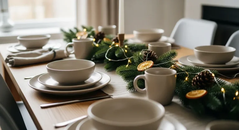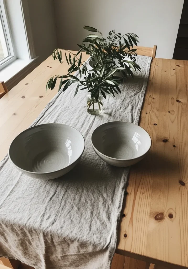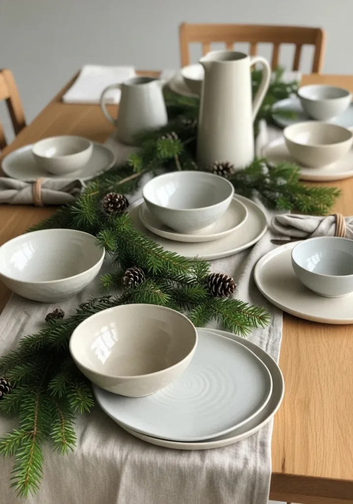 This setup brings the essence of a forest inside. A soft gray linen runner holds ceramic plates, light stoneware bowls, and a garland of fresh pine with small pinecones nestled between. The neutral tones let the greenery take center stage, creating a calm, nature-inspired scene.