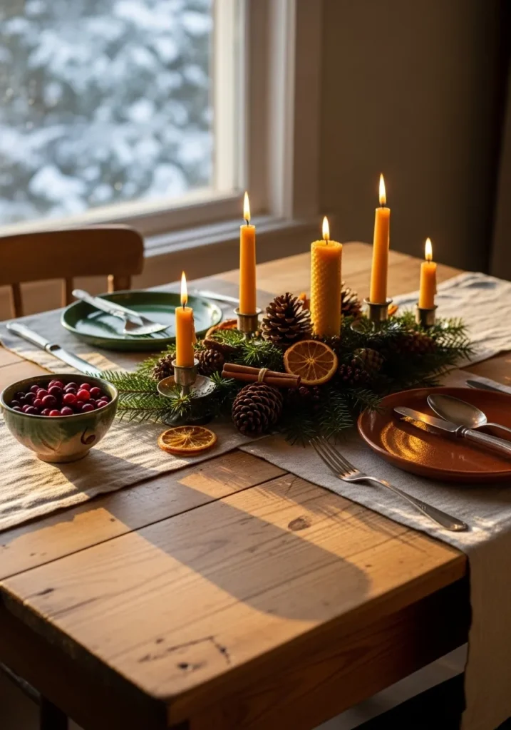 This table feels like a cozy winter afternoon wrapped in warmth. Beeswax candles in amber hues stand tall among pinecones, dried oranges, and sprigs of evergreen, creating a soft golden light that dances across the table. The mix of textures—smooth wood, fresh greenery, and glowing wax—makes the whole scene feel inviting and full of holiday spirit.
