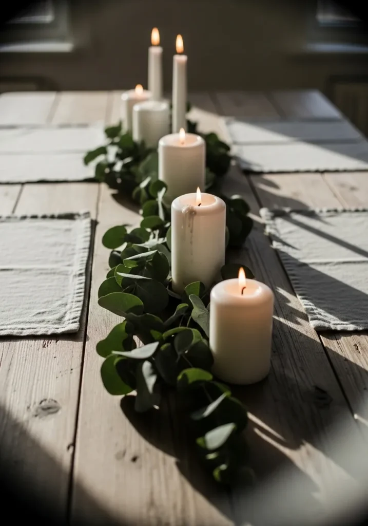 This table setting feels like calm captured in candlelight. A rustic wooden table is dressed with a simple trail of eucalyptus leaves and softly glowing white candles. The mix of natural greenery and warm candlelight brings a sense of peace and simplicity, making the entire scene feel effortlessly elegant and soothing.