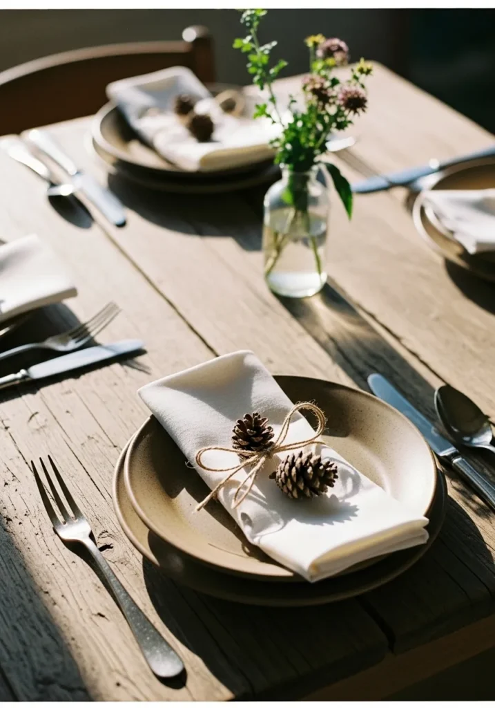 I can’t help but smile at how homey this feels. The sunlight on the wood, the tiny pinecones, the soft linen—it all just works together so naturally. It’s the kind of table that feels personal and inviting, like it was made with love, not just for looks.