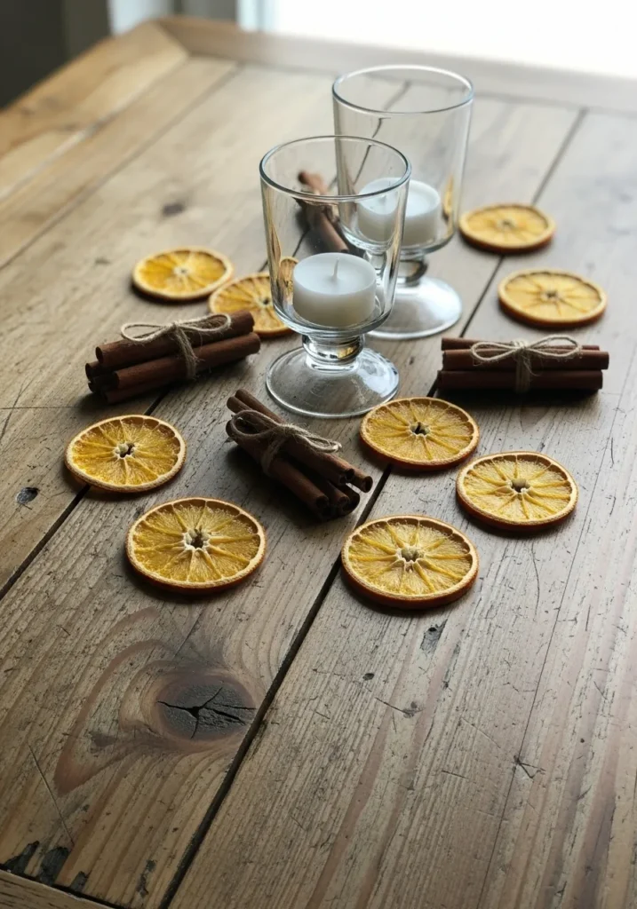 This table is pure Christmas magic in the simplest form. Dried orange slices and cinnamon sticks tied with twine scatter beautifully across a wooden surface, surrounding glass candles that glow softly. The scent must be heavenly—warm, spiced, and citrusy all at once. It’s rustic, aromatic, and perfectly imperfect.