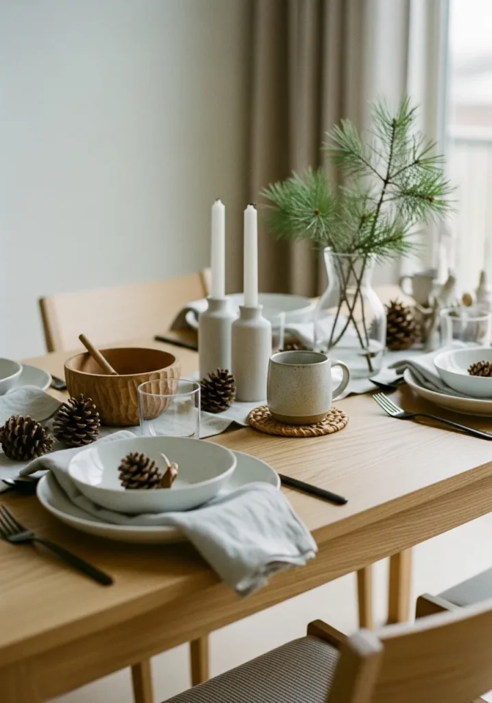 This table blends Nordic simplicity with nature’s warmth. Smooth stoneware plates, linen napkins, pinecones, and delicate sprigs of evergreen come together effortlessly on a pale wooden table. Ceramic candles and wooden accents complete the look, creating a cozy, organic setup that feels both modern and festive.