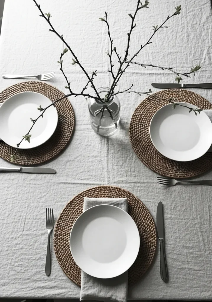 This table setting is all about quiet simplicity. A soft linen tablecloth creates a serene base, while woven placemats add warmth and texture. At the center, a glass vase holds a few bare branches with tiny budding leaves, creating a striking yet peaceful focal point. The whole scene feels uncluttered and balanced, like nature was invited to dinner.
