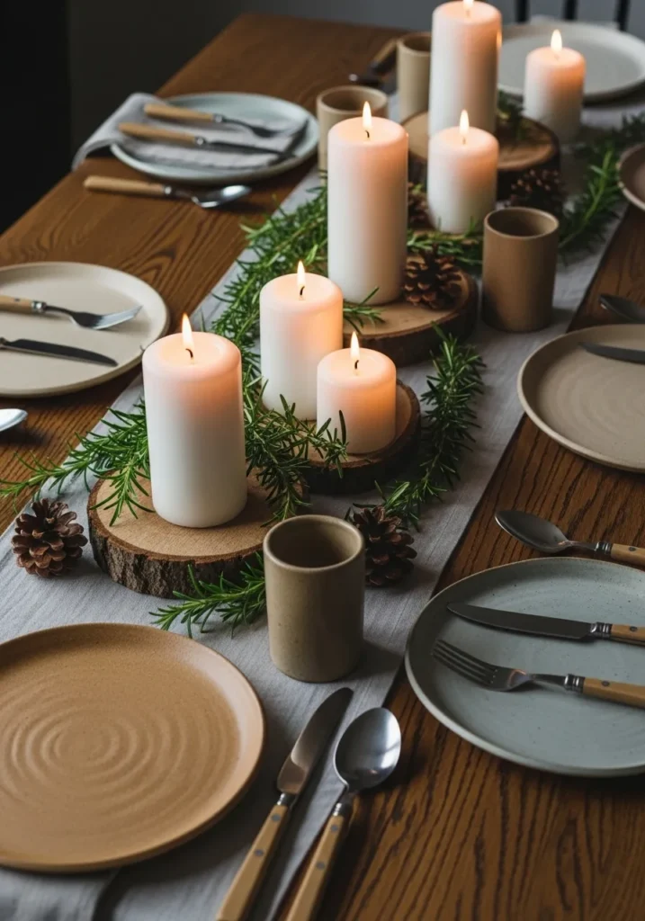 This setup brings together everything beautiful about nature and simplicity. Large white pillar candles sit on slices of wood, surrounded by pinecones and sprigs of rosemary that add just the right touch of green. The soft, neutral tones of the tableware keep things grounded while letting the candlelight take center stage.