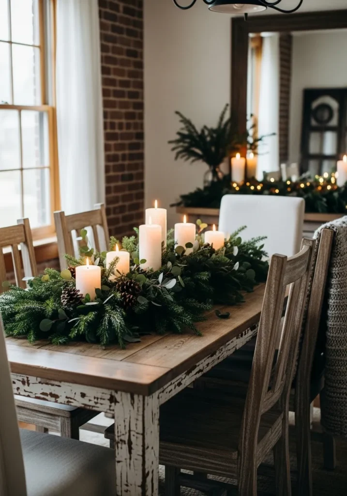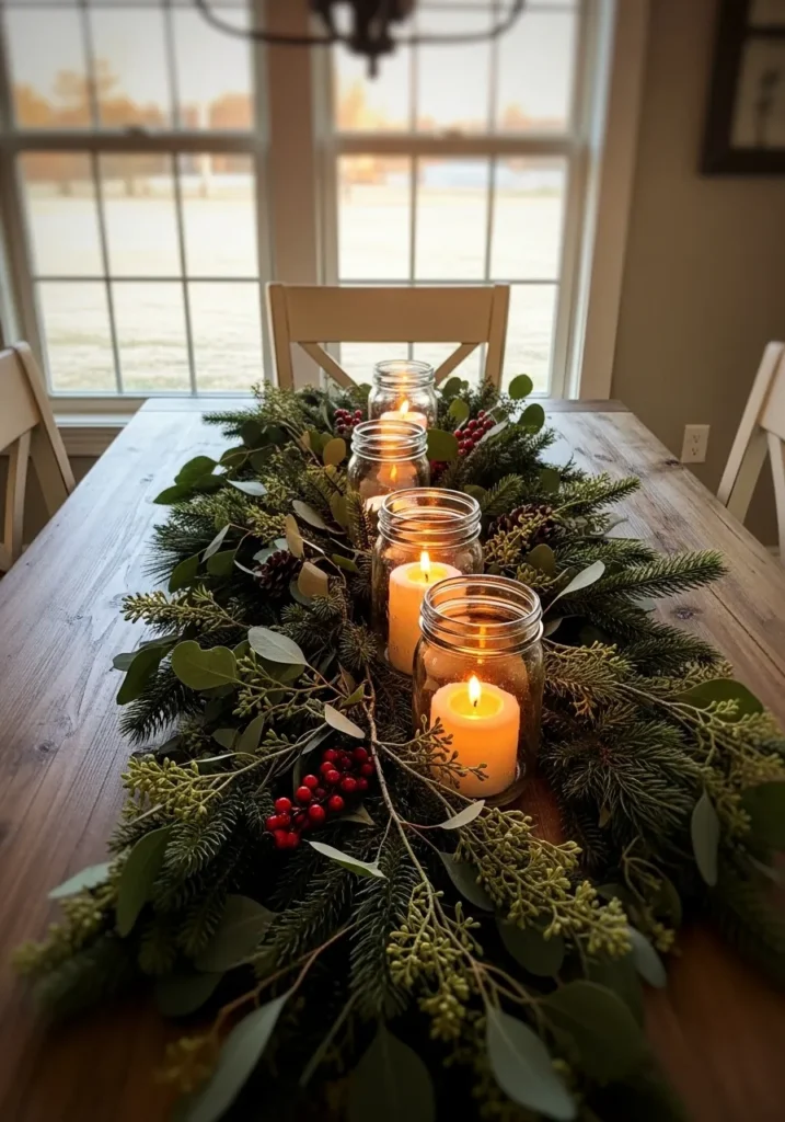 This design blends rustic charm with a soft, romantic glow. A reclaimed wooden table becomes the perfect base for a lush garland of pine, eucalyptus, and red berries, dotted with mason jars holding flickering candles. The natural light streaming in from the window gives everything a peaceful farmhouse feel.