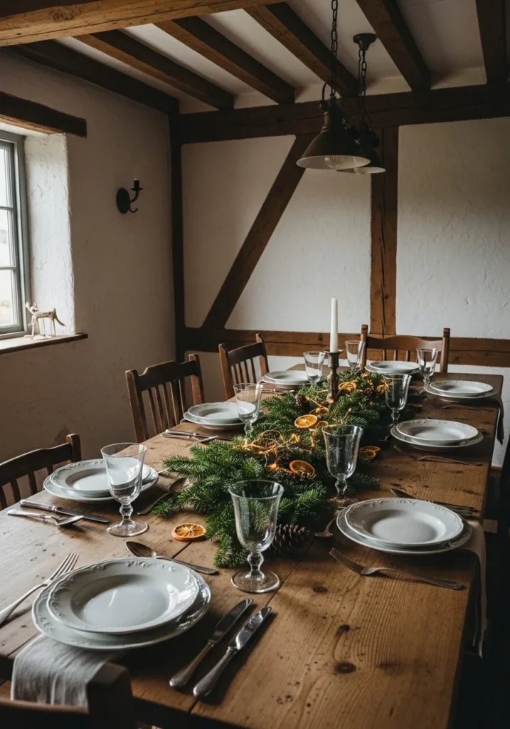 This design is all about rustic elegance. A long wooden table is decorated with evergreens, pinecones, and slices of dried oranges that catch the light beautifully. The warm tones of the wood and soft glow of candles make the whole space feel cozy and timeless.