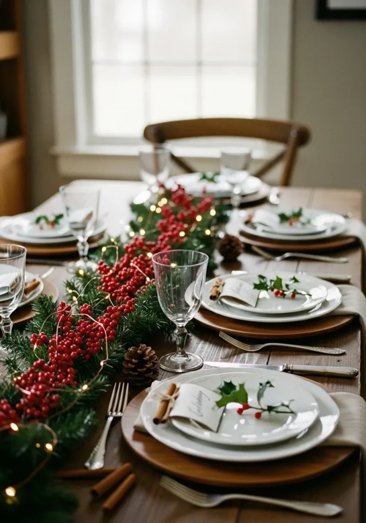 This table captures that picture-perfect farmhouse Christmas aesthetic. A wooden table hosts a lush garland of pine and red berries intertwined with fairy lights. Each place setting features natural touches like holly and cinnamon sticks, creating a cohesive and festive look.