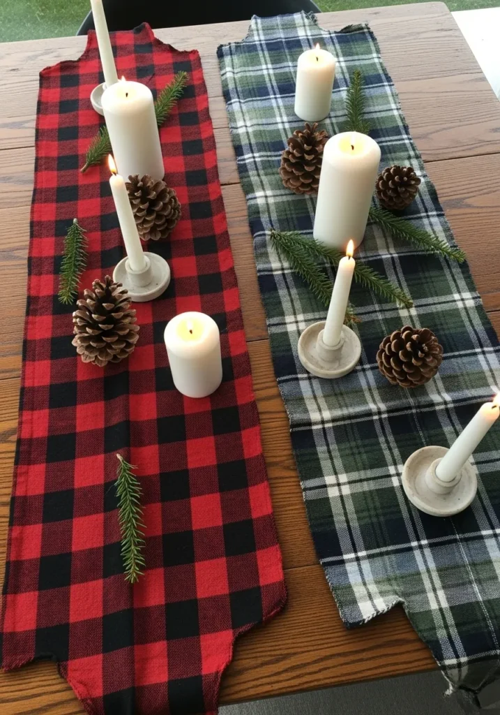 This rustic table design uses two plaid runners in classic red and green to bring instant holiday warmth. Pinecones and fresh evergreen sprigs are scattered between white candles, creating a simple but striking centerpiece. The contrast of patterns feels playful and relaxed, perfect for a home that embraces cozy cabin charm.