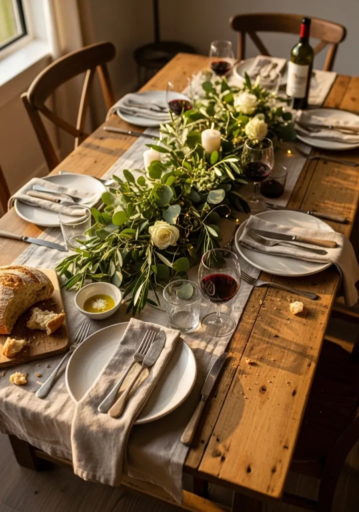 This table looks like it belongs in a sunlit farmhouse kitchen. The centerpiece, made of lush greenery and cream roses, stretches across a rustic wooden table lined with linen napkins and glowing candles. The soft light catches the wine glasses and bread crumbs, making the whole scene feel relaxed and real.