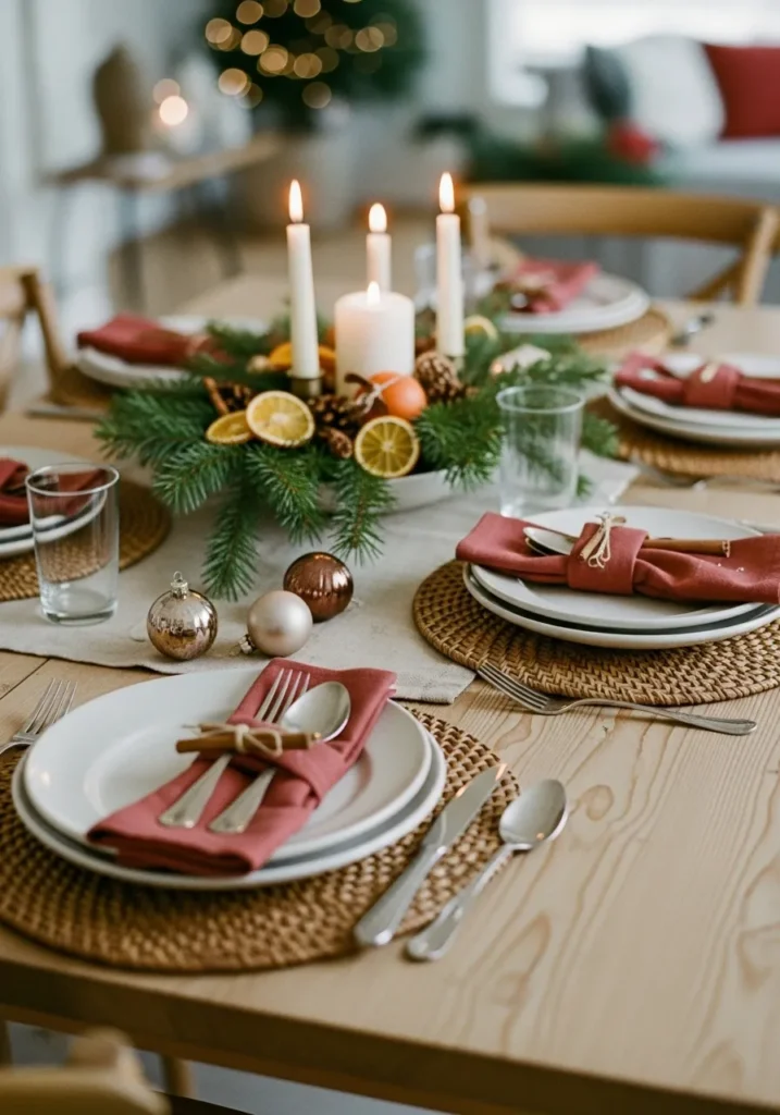 This cheerful table bursts with Christmas personality. The natural pine centerpiece is decorated with dried orange slices, cinnamon sticks, and small pinecones. Red napkins and woven placemats bring texture and color, while candles add a soft glow that ties everything together.
