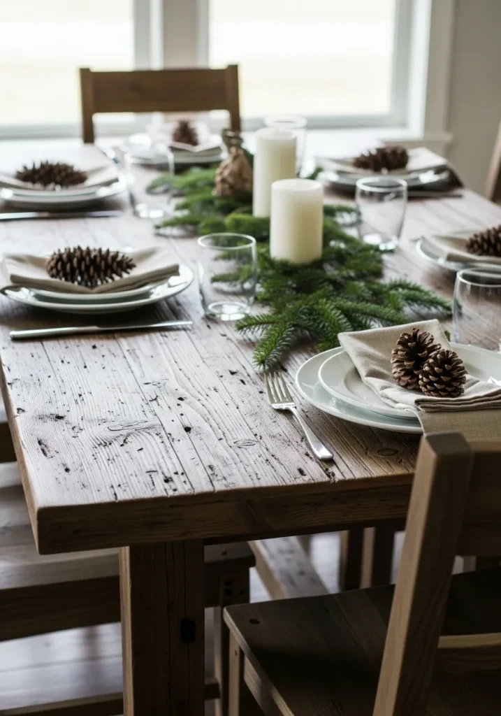 This rustic table captures the essence of simplicity. A weathered wooden surface serves as the backdrop for a natural centerpiece made of pine branches and soft white candles. Each place setting features neutral napkins topped with pinecones, adding a touch of woodland texture. The entire look feels clean, calm, and perfectly cozy.