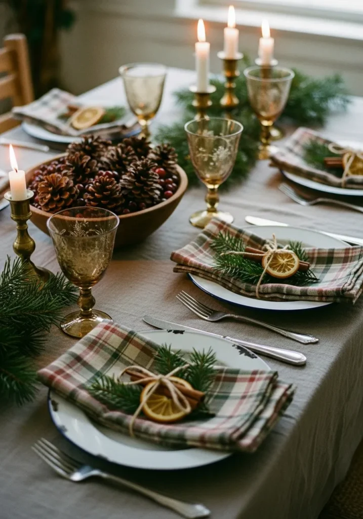 Here’s a table that feels both rustic and refined. Plaid napkins tied with twine, dried orange slices, and sprigs of pine create a nature-inspired look that feels straight from a cozy cabin. The golden candleholders add a soft vintage glow, while the pinecones add texture and warmth.