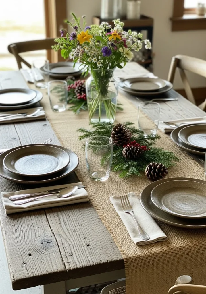 This setup celebrates the beauty of simplicity. The weathered wooden table pairs beautifully with a burlap runner lined with evergreens, pinecones, and sprigs of berries. A vase of wildflowers adds a touch of life and color, keeping things fresh and unpretentious.