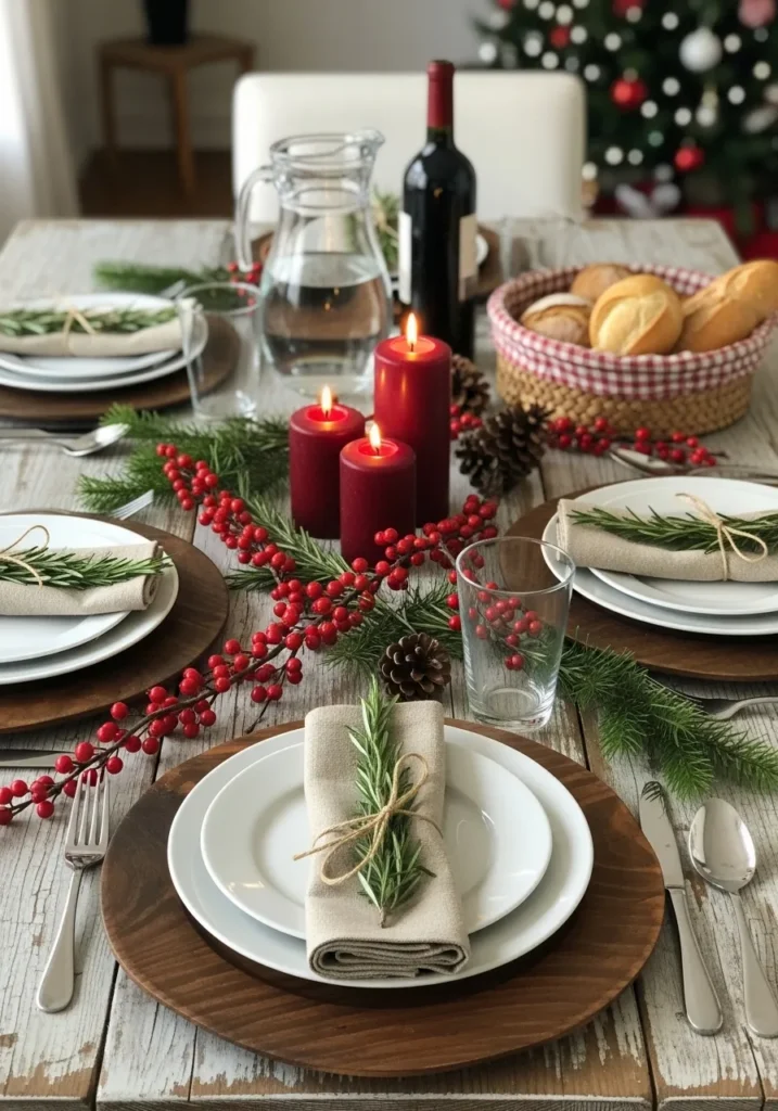This rustic Christmas table bursts with warmth and personality. The whitewashed wooden surface is dressed with red berry garlands, pine branches, and bold red candles that glow beautifully against the greenery. Natural napkins tied with rosemary sprigs bring a lovely organic touch.