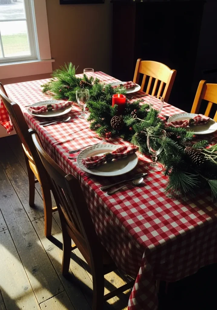 I love how simple yet inviting this setup feels. There’s something so comforting about the mix of checkered fabric and natural greens—it reminds me of cozy family dinners and the joy of uncomplicated holiday decorating. Sometimes, all it takes is a few classic touches to make a table feel like home.