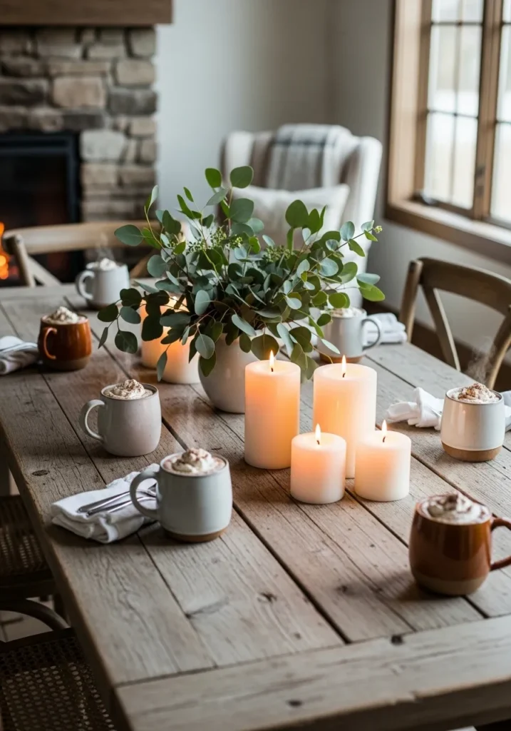 This scene feels like the heart of winter comfort. A rustic wooden table is dressed with soft candlelight, warm mugs of cocoa topped with whipped cream, and a vase of eucalyptus that adds a fresh, earthy touch. The glow from the nearby fireplace makes the whole setting radiate warmth.