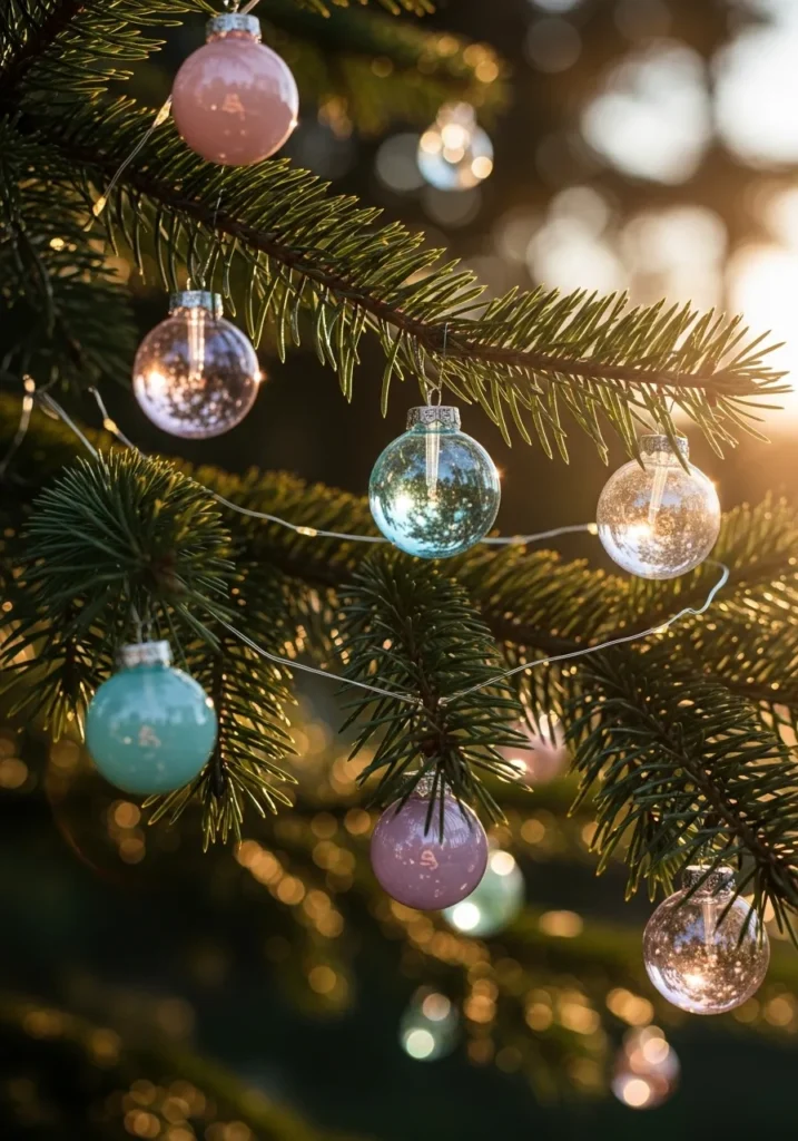 These glossy pastel ornaments shimmer gently in the fading daylight, bringing a delicate, dreamy touch to the branches. Shades of blush, mint, and icy blue create a soft, luminous look, while the sunlight catches on each globe, making them sparkle like bubbles.