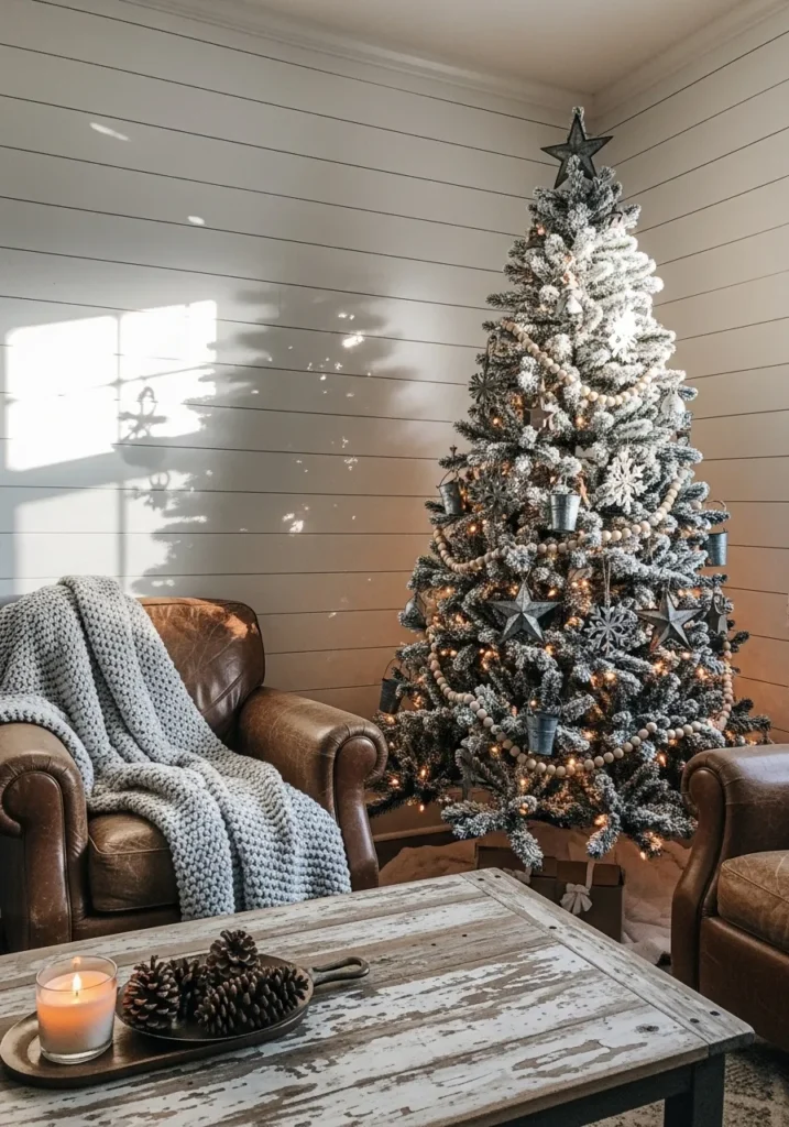 This snowy tree fits right into a cozy farmhouse corner, surrounded by soft knits and natural textures. The frosted branches sparkle under warm lights, and the wooden beads and metal stars add the perfect rustic detail.