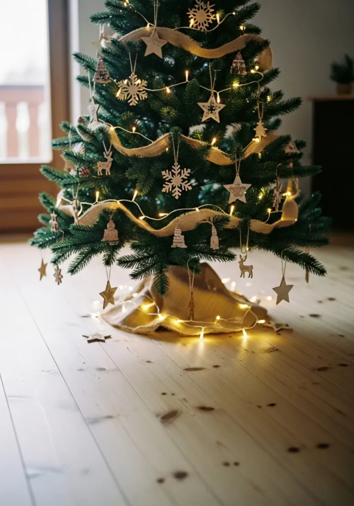 This tree captures that charming farmhouse feel with burlap ribbons and simple wooden ornaments shaped like stars, deer, and snowflakes. The soft yellow glow of the string lights adds warmth to the neutral palette, creating a cozy, homespun Christmas moment.
