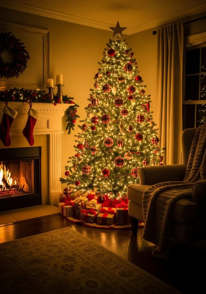 This tree is the definition of timeless Christmas elegance. Red and gold ornaments shimmer under hundreds of twinkling lights, while wrapped gifts and a glowing fireplace make the whole room sparkle with warmth. It’s festive, traditional, and full of cheer.