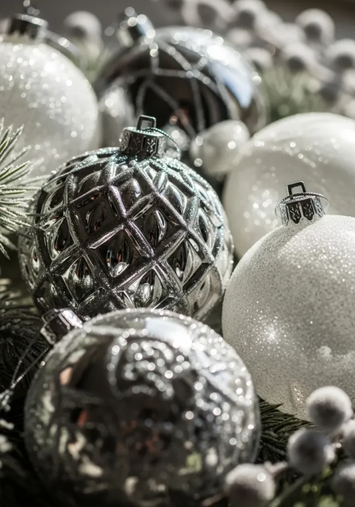 Here, cool metallic tones take center stage. The mix of matte white and shiny silver ornaments creates a sophisticated shimmer that feels crisp and modern. Under natural light, every little glint seems to dance, adding instant glamour to any tree.